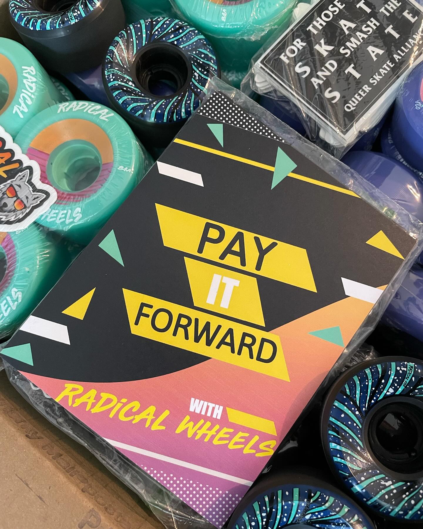 Sign up or donateCan't quite afford or access skate wheels? Or looking to help someone access wheels who can't? Find out more about the Pay It Forward program that Radical Wheels has, where free wheels are sent out monthly to those in need without asking any invasive financial information.