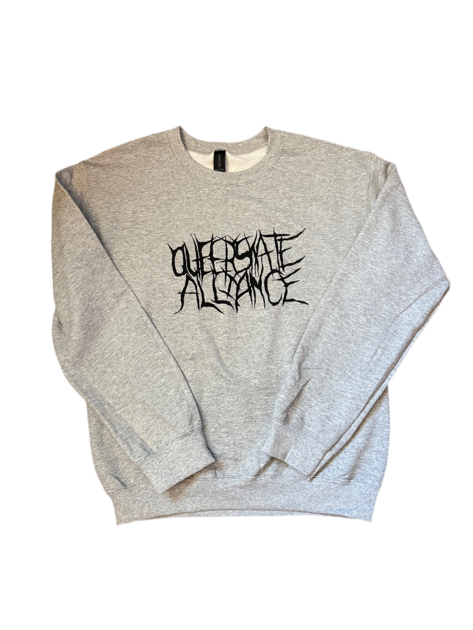 Grey GIldan crewneck sweatshirt with "Queer Skate Alliance" printed on the front in black.